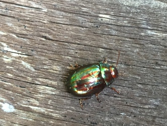 The beetle is distinctive and strikingly beautiful. Catching and reflecting the light on its chrome like back, the beetle is approximately 1 cm in length and has metallic green and purple stripes.